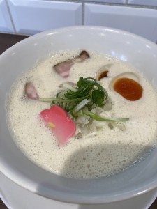 白く泡立ったスープの下に煮卵2つと、鶏、豚のチャーシューが‼️