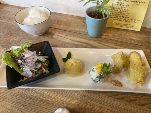 白和えとか、ひじきのダーサラとか、芋のきんとんとか好物がずらーっと並んだワンプレートとママさん特製の大根のポタージュ✨